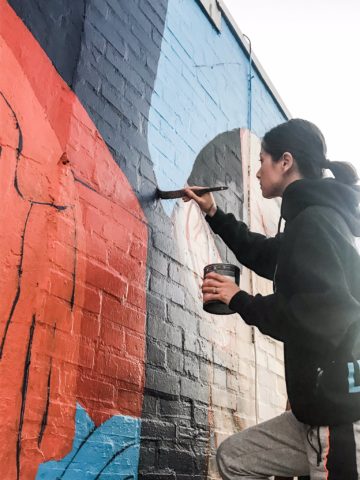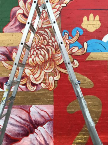 The kabuki play depicted in my mural is called “The Medicine Peddler.” In the story, an undercover samurai is disguised as a seller of “uiro,” a mysterious silver pill which is said to cure anything. I had a few fantastic volunteers help me with this project, and while we were painting, we were able to discuss Japan, public art, and the business of painting murals. It was also great to hear all the cheers of passersby and see them excitedly taking pictures to share on social media.